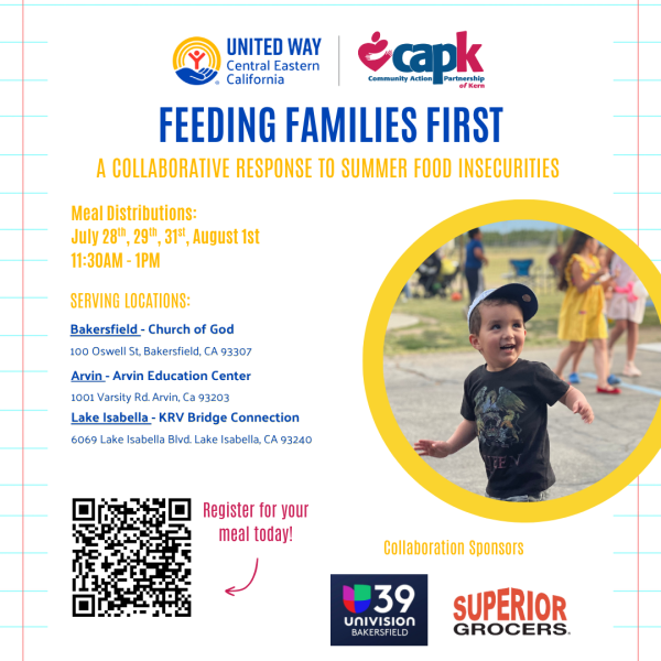 United Way of Central Eastern California (UWCEC) & Community Action Partnership of Kern (CAPK) are proud to present Feeding Families First, a collaborative summer food distribution. This is a community-driven response supported by partnerships with CAPK and regional grocery retailers.